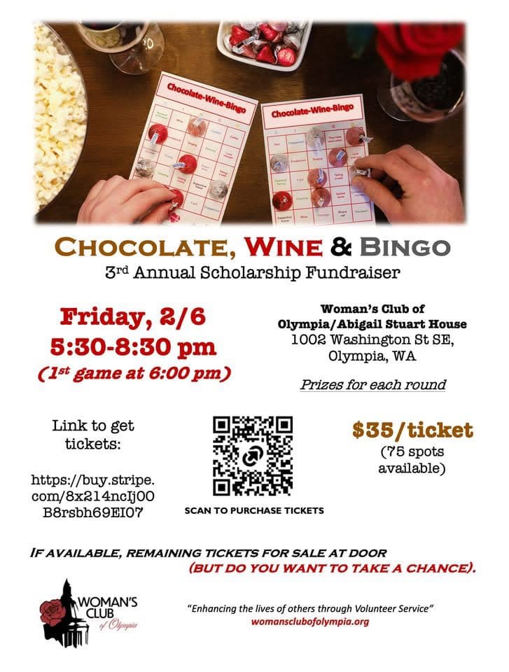 This is our 3rd annual Chocolate, Wine and Bingo scholarship fundraiser. Tickets are available online through the Abigail Stuart House website.....www.abigailstuarthouse.com