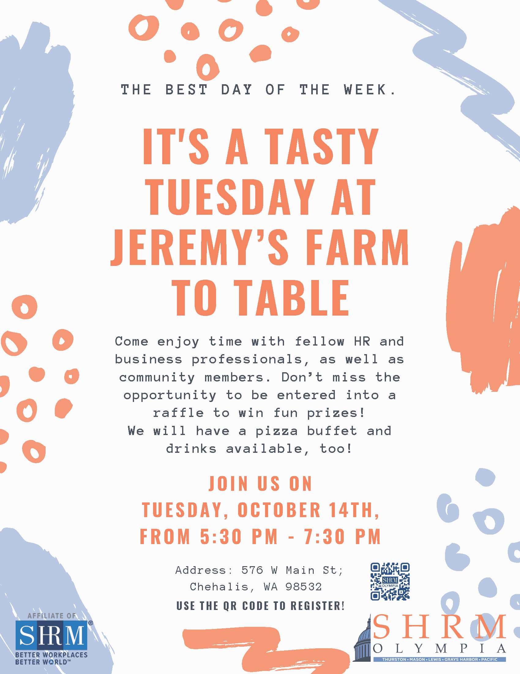 Come enjoy time with fellow HR and business professionals, as well as community members. Don’t miss the opportunity to be entered into a raffle to win fun prizes! We will have a pizza buffet and drinks available, too!
