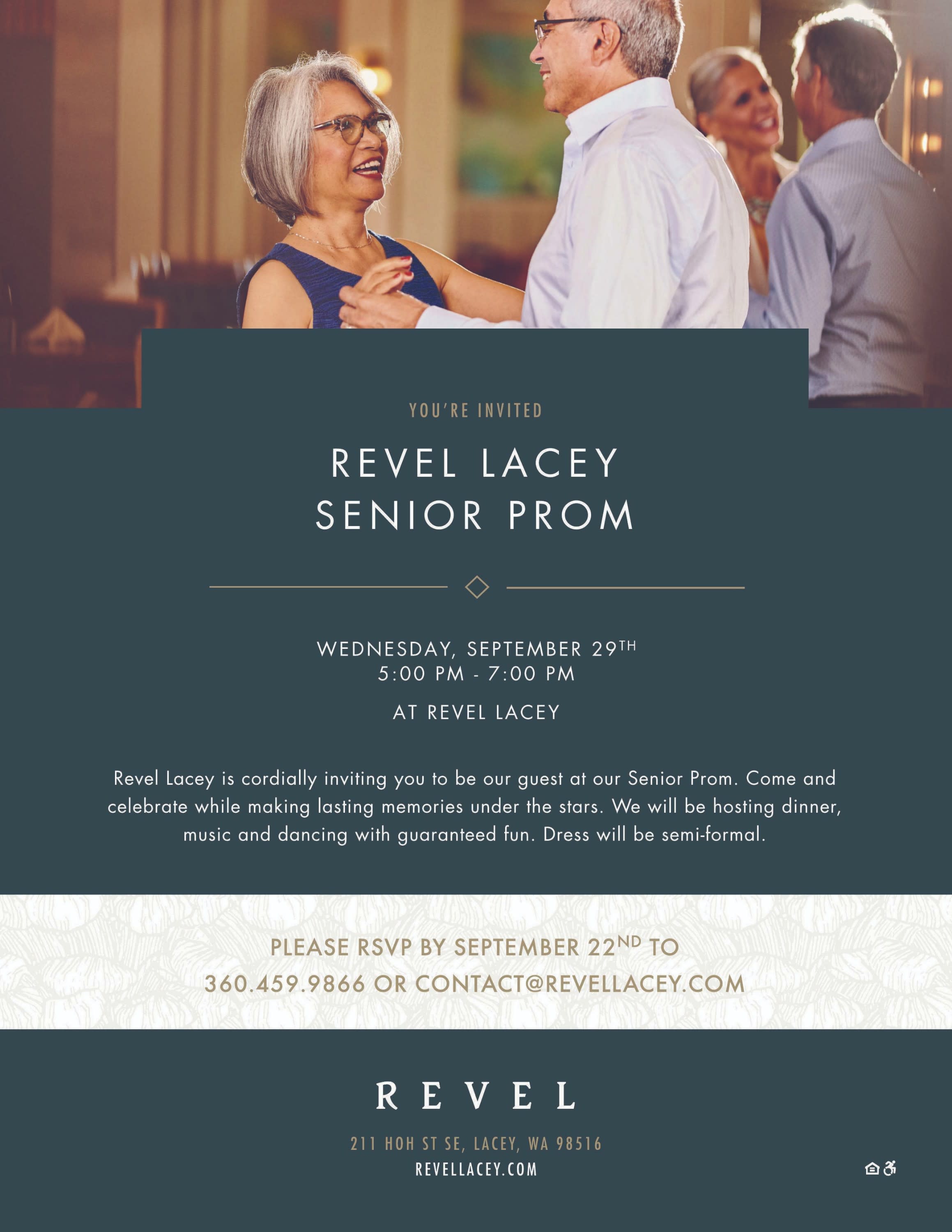 Seniors are invited to our upcoming First Annual Senior Prom where will be awarding a “King & Queen” of the night, live music while dancing under the Stars! If you know of any Senior interested we would love to have them as our guest. And as always see what Refined and a Vibrant Active Community is like! Revel in the evening at Revel Lacey.Images