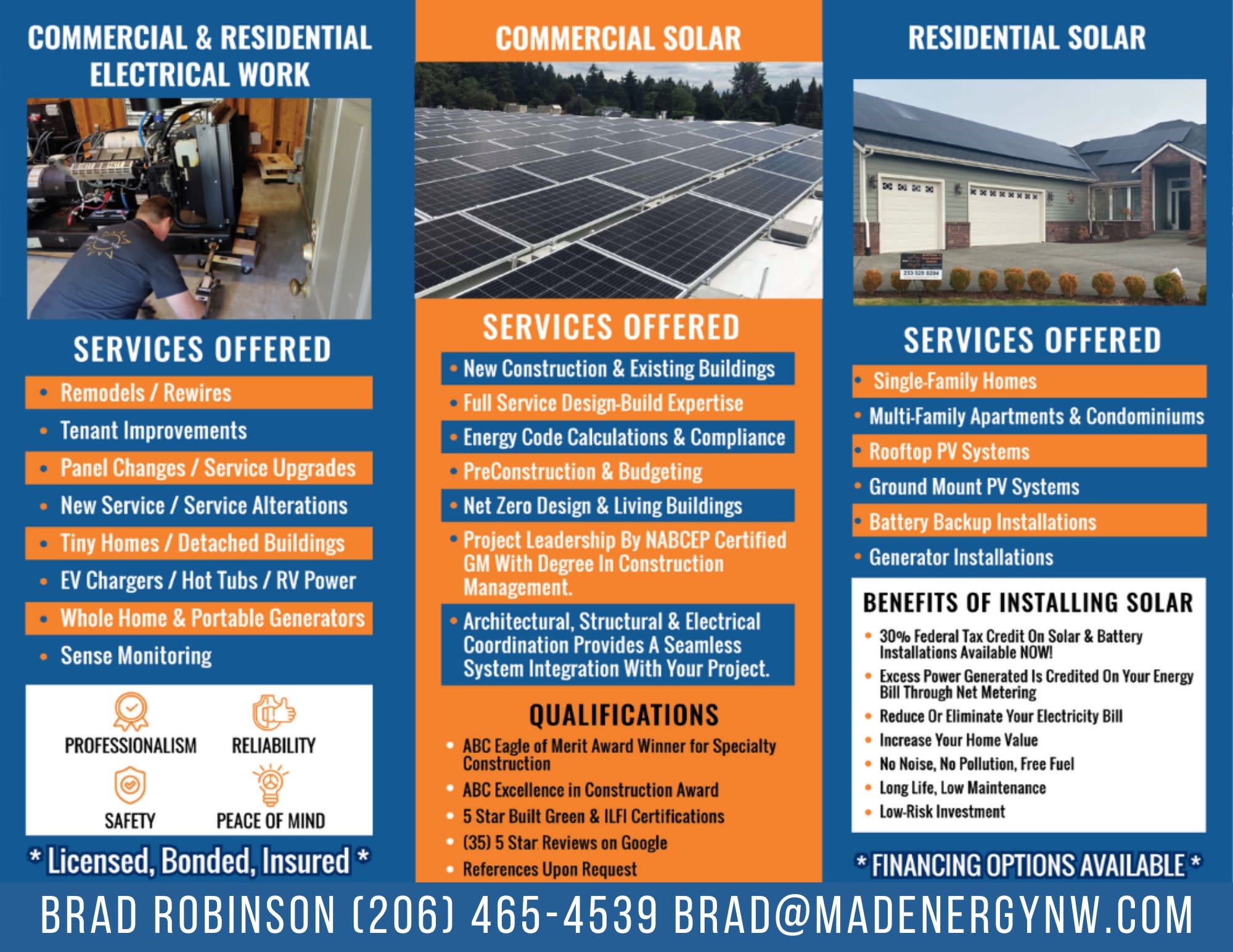 Having issues with outages? Want to take advantage of PSE and Tax Credits? Make your business or home green and get rid of an ever rising bill with MAD Energy. We offer one of the highest-trained teams in Washington State for solar and battery installations in addition to our everyday electrical work. We offer $500 off of installs to fellow Chamber members and will walk you through the process of available credits that can pay you back up to half of your initial investment. Financing available.